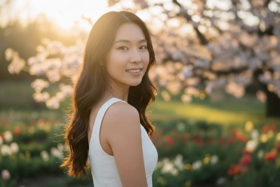 Prompt 3: Create an 8/3 avatar preserving the original face and natural expression. Medium shot, slightly turned back pose with head looking toward the camera. Eye-level camera, 50mm focal length. Flower garden at sunset with backlight creating a glow around hair and shoulders. Warm film tone, shallow depth of field. High detail, 4K quality, square 1:1 composition.