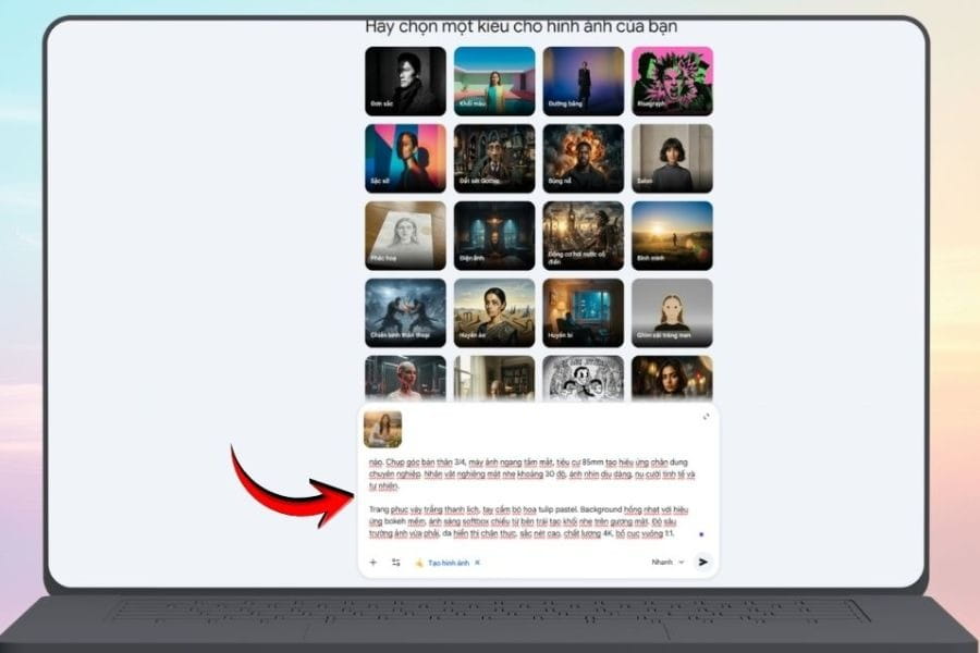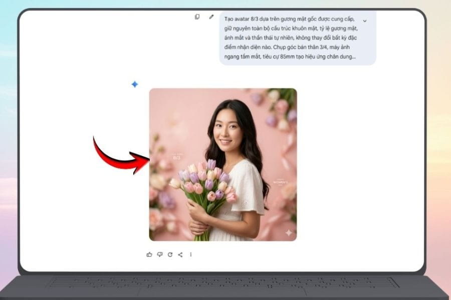 After uploading the image, enter your prompt describing the desired style. Clearly mention the 8/3 atmosphere with flowers, pastel backgrounds, or soft lighting. You can also include outfit details like a white dress, áo dài, or modern fashion. If creating for social media, don’t forget to specify a 1:1 ratio.