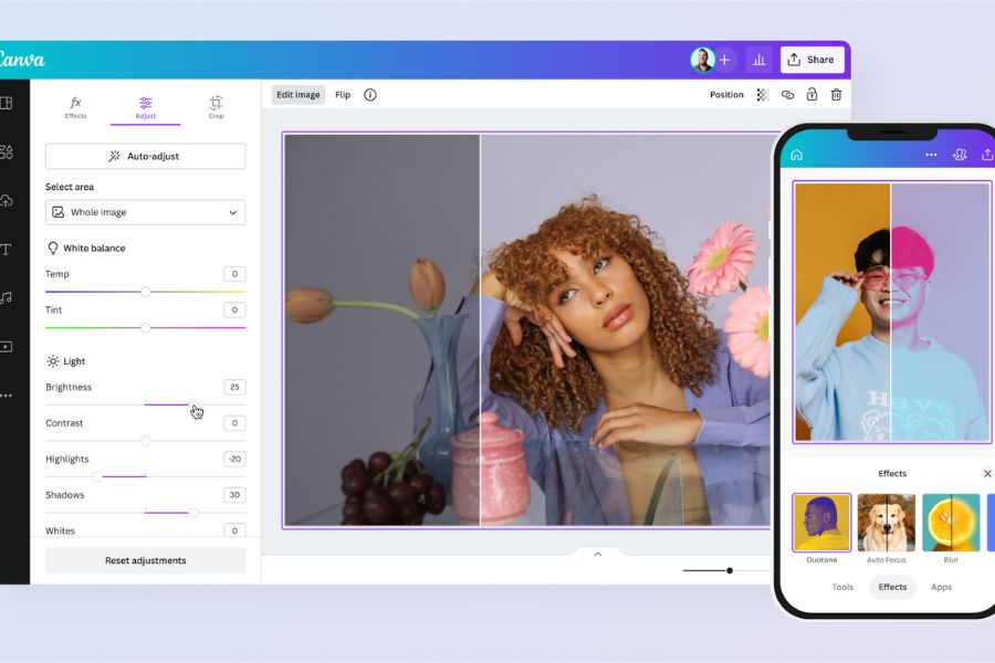Drag the selected image into your design. Use “Edit Image” to crop, resize, rotate, apply filters, adjust colors, and enhance details. You can also add text, lighting effects, or combine with Canva elements.