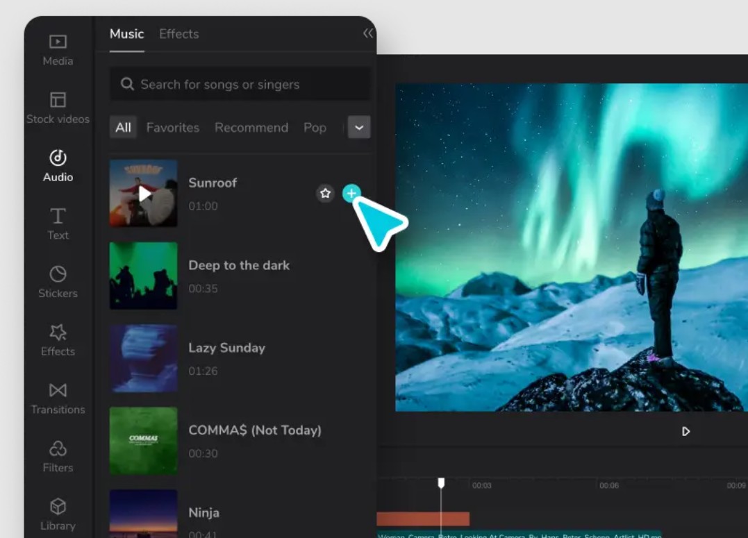 Adding sound and effects to your timeline is simple. Just select your desired effect from the left-hand panel, then click the “+” sign to add it to your video. CapCut’s effects are designed with a modern aesthetic, suitable for a variety of content styles, from product advertisements to internal communications videos.