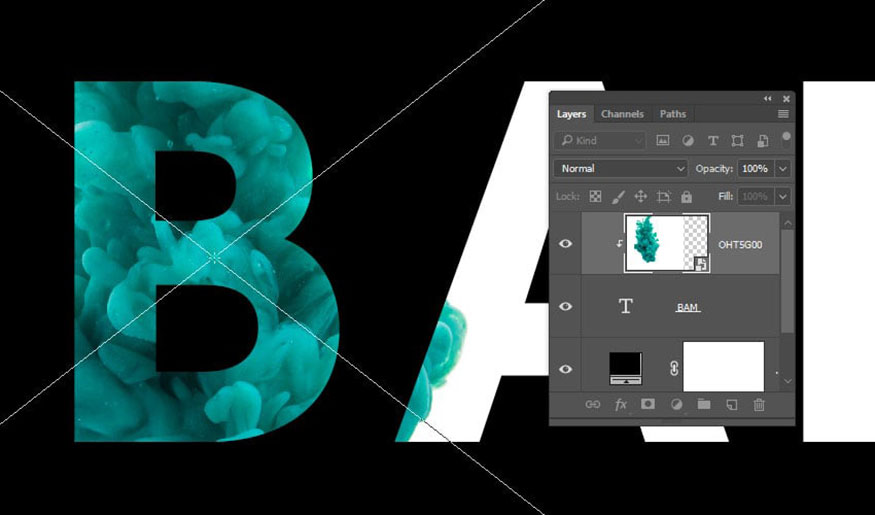 Step 1: On the menu bar, go to File => Place Linked and open the downloaded Teal colors and ink in water image. Press the Return key and right-click on the layer to select Create Clipping Mask.