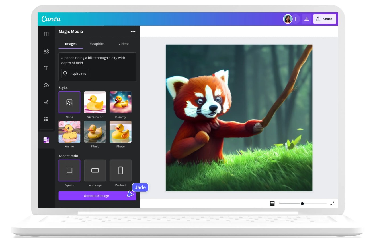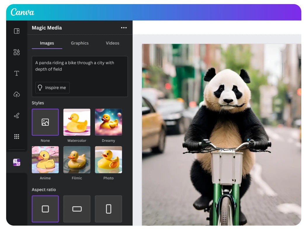 For example, if you type in the description “A panda riding a bicycle through a neon-lit cityscape,” in just a few seconds, Canva will return AI-generated images, complete with lighting, perspective, and detail, ready for you to insert right into your presentation, media publication, or social media post.