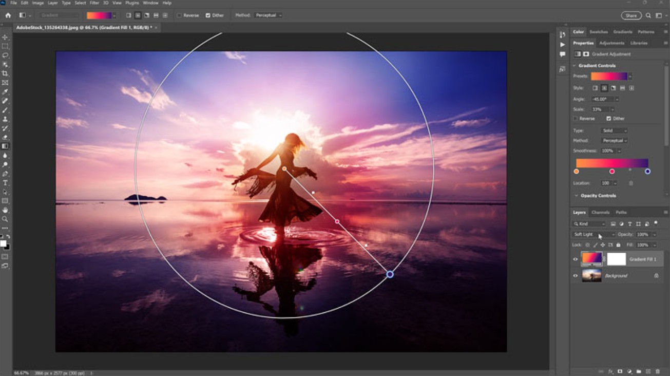 The Gradient Tool's versatility makes it an indispensable tool for color blending, especially when you want to create soft lighting or harmonious highlights and shadows without losing image detail.