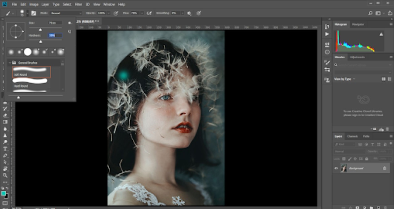 While Gradient and Blending Modes help you with the big picture, the Brush Tool is your tool for fine-tuning the details. Using the Brush in combination with blending modes allows you to “paint” subtle shades of light and dark into your image, giving it more depth and a more natural feel.