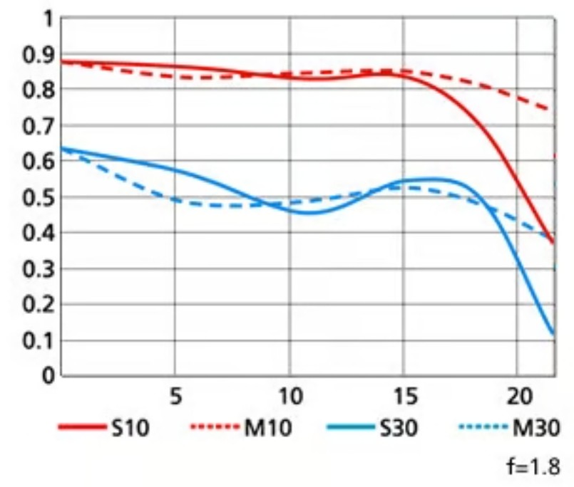 MTF indicates the lens's ability to reproduce contrast and sharpness from the center to the edges. A lens with a pronounced field curvature will have an MTF line: