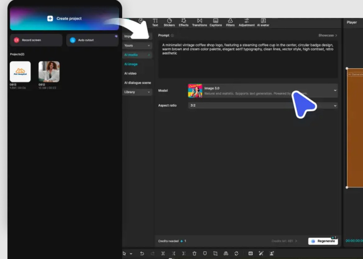 Users begin by creating a new project in CapCut, then navigate to the “AI media” section and select “Text to image”. Here, you enter a detailed description of your desired logo, including style, colors, emotion, and brand domain. The clearer the description, the more accurately the AI will produce results that meet expectations.