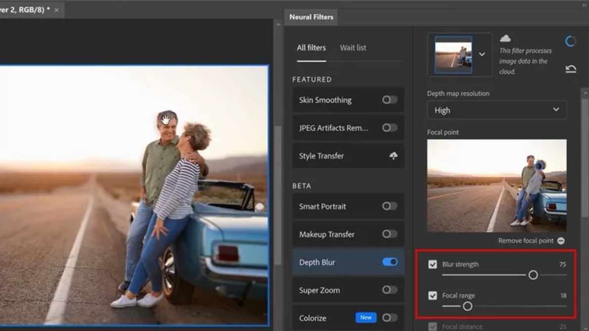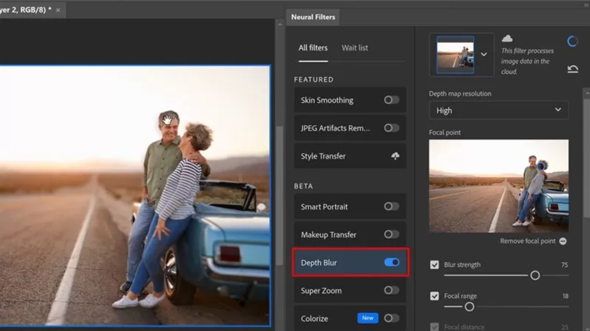 After opening the Neural Filters panel, locate the Depth Blur tool. When you toggle it on, Photoshop will begin analyzing the image and automatically apply a blurring effect to the background.