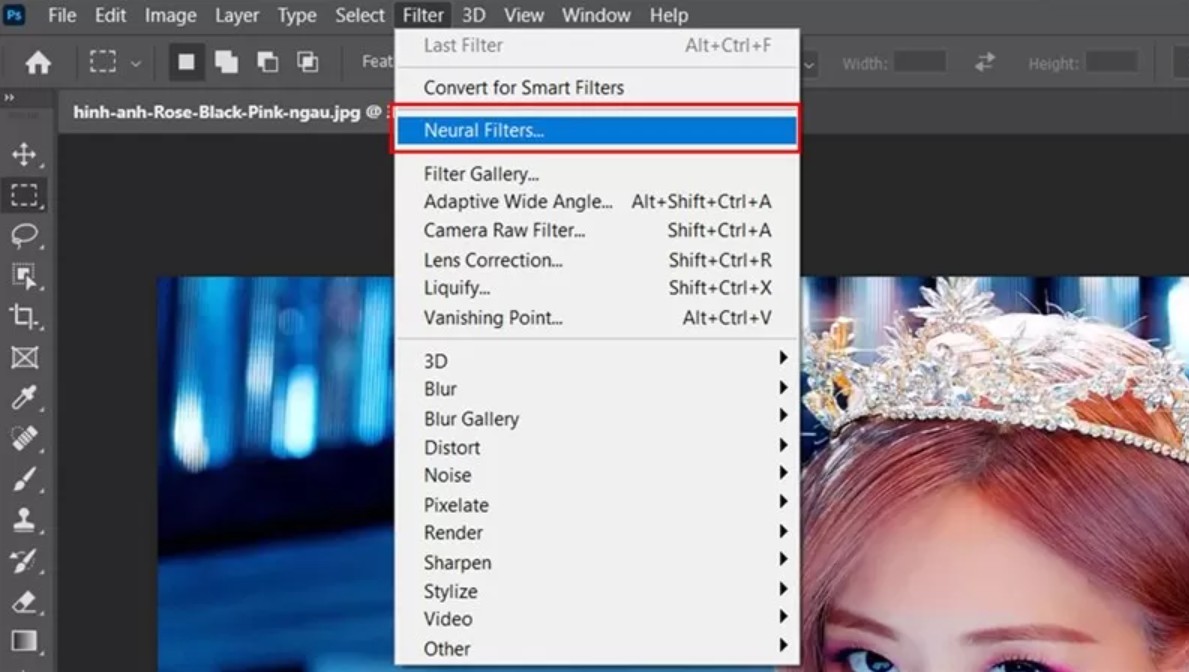 Here, select the Filter tab, then click on Neural Filters. Immediately, a new control panel will appear on the right side of the screen. This area contains Photoshop's intelligent AI-powered filters, including Depth Blur.