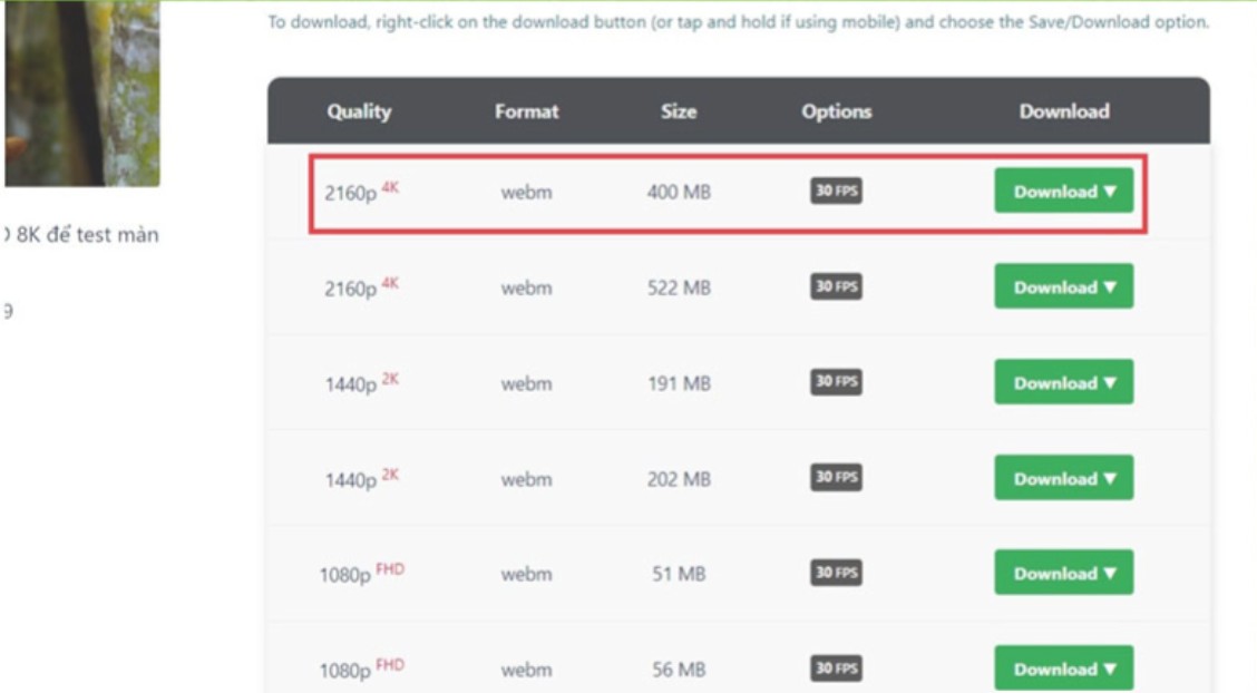 After clicking download, a list of resolutions will appear. Simply select 2160p to download the video in 4K quality.