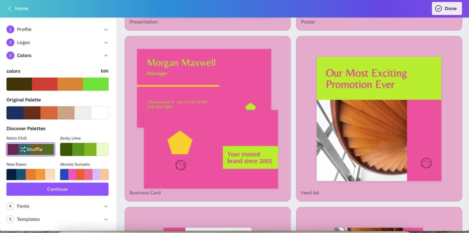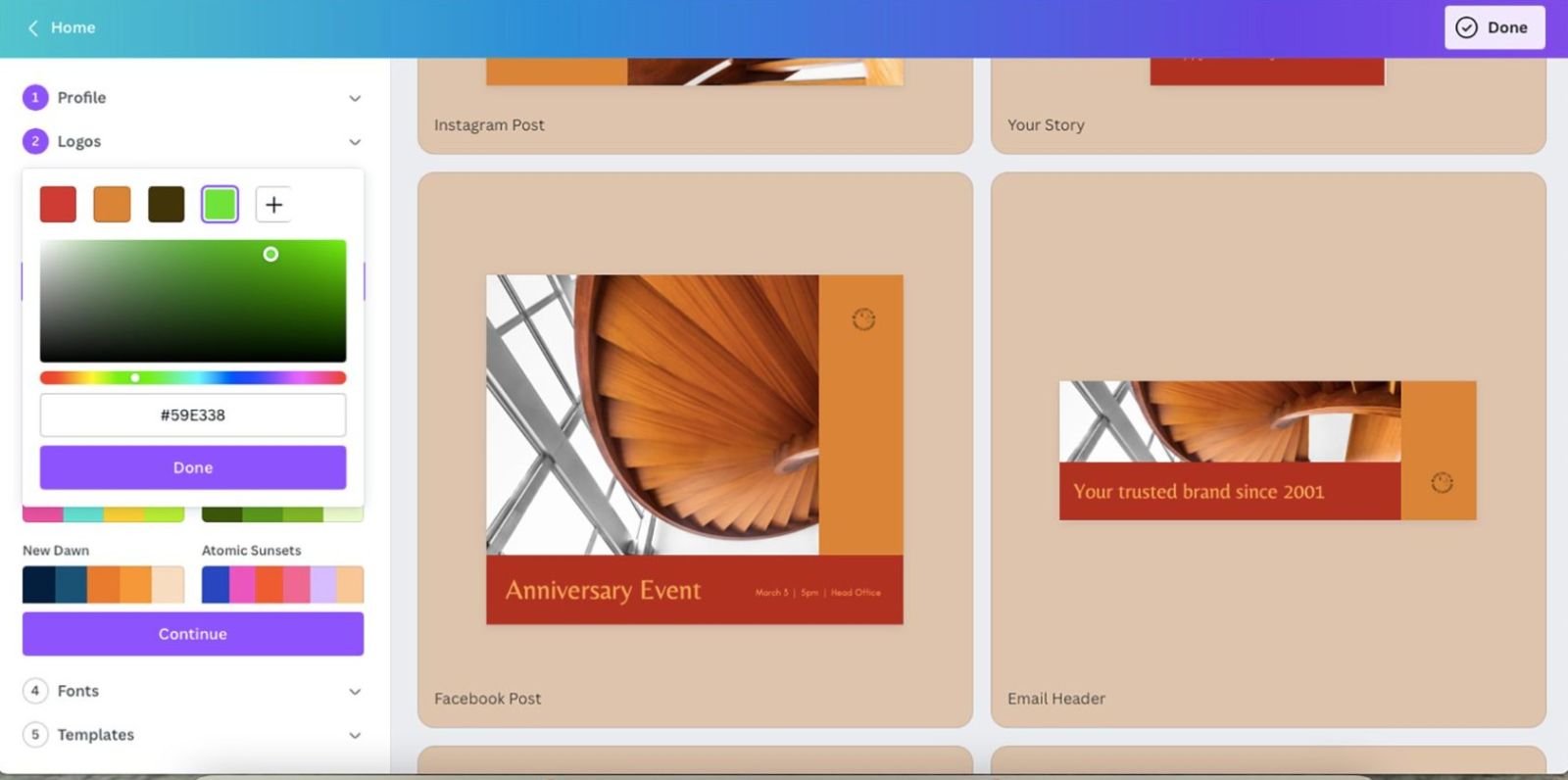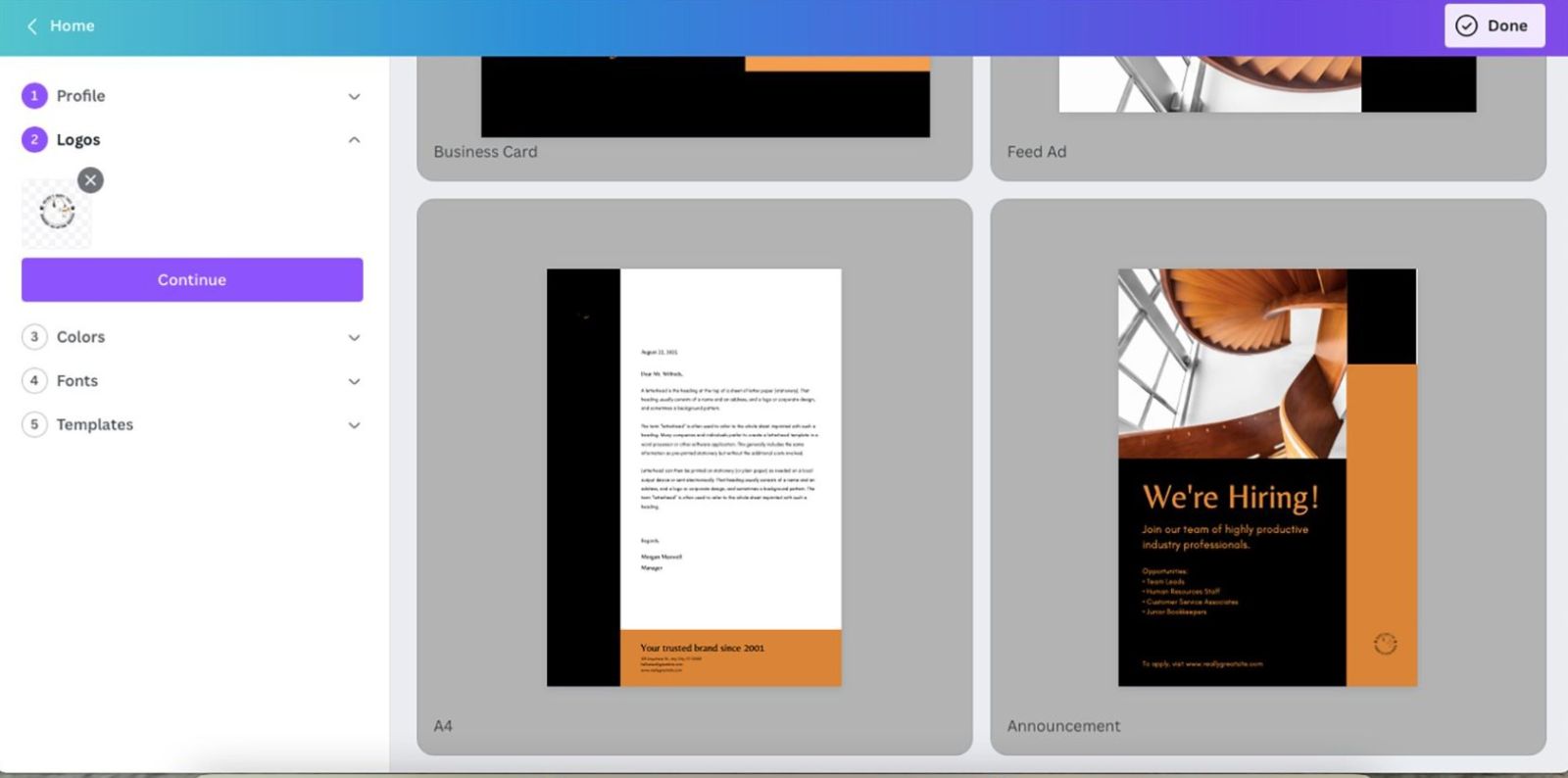 When you choose a template, you'll see all your colors, fonts, and logo applied to the design series. This step helps you assess whether the branding elements work well together. For example, if the template style is minimalist but you use an overly elaborate font, it can create a mismatch. Canva allows you to go back and edit any element until you're completely satisfied with the result.