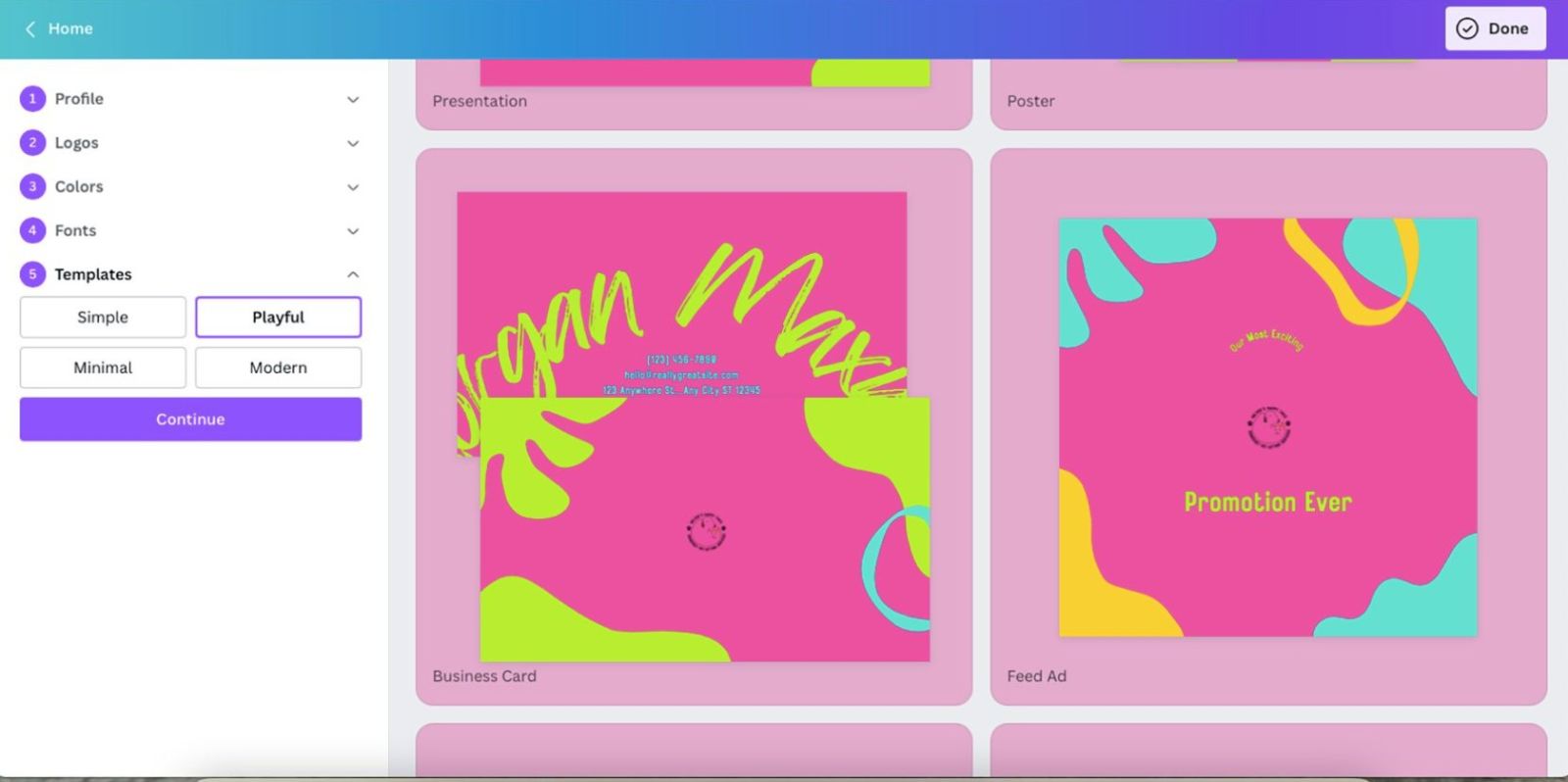 Templates are the final step in the brand kit development process, but they play a crucial role in ensuring consistency when applying the brand to the actual design. Canva offers four basic template styles to choose from: simple, playful, minimalist, and modern. Each style reflects a distinct brand personality.