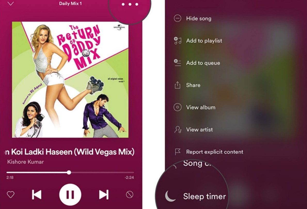 To do this, first open the Spotify app and access the song you want to listen to before bed. In the upper right corner of the screen, you'll see a three-dot icon; this is where you'll find advanced options for the song. Clicking on it will reveal a list of expanded options for the currently playing song.