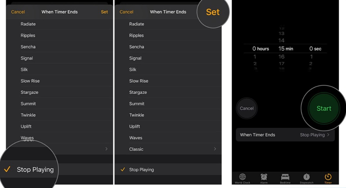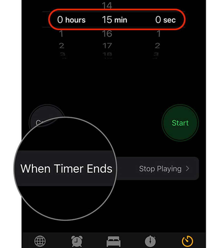 In the Timer section, select the desired playback duration before the music automatically stops. Next, tap on When Timer Ends and select Stop Playing. This is a special iOS feature that allows you to stop all sound when the countdown timer finishes. After setting it up, simply tap Set and then Start to begin the timer.