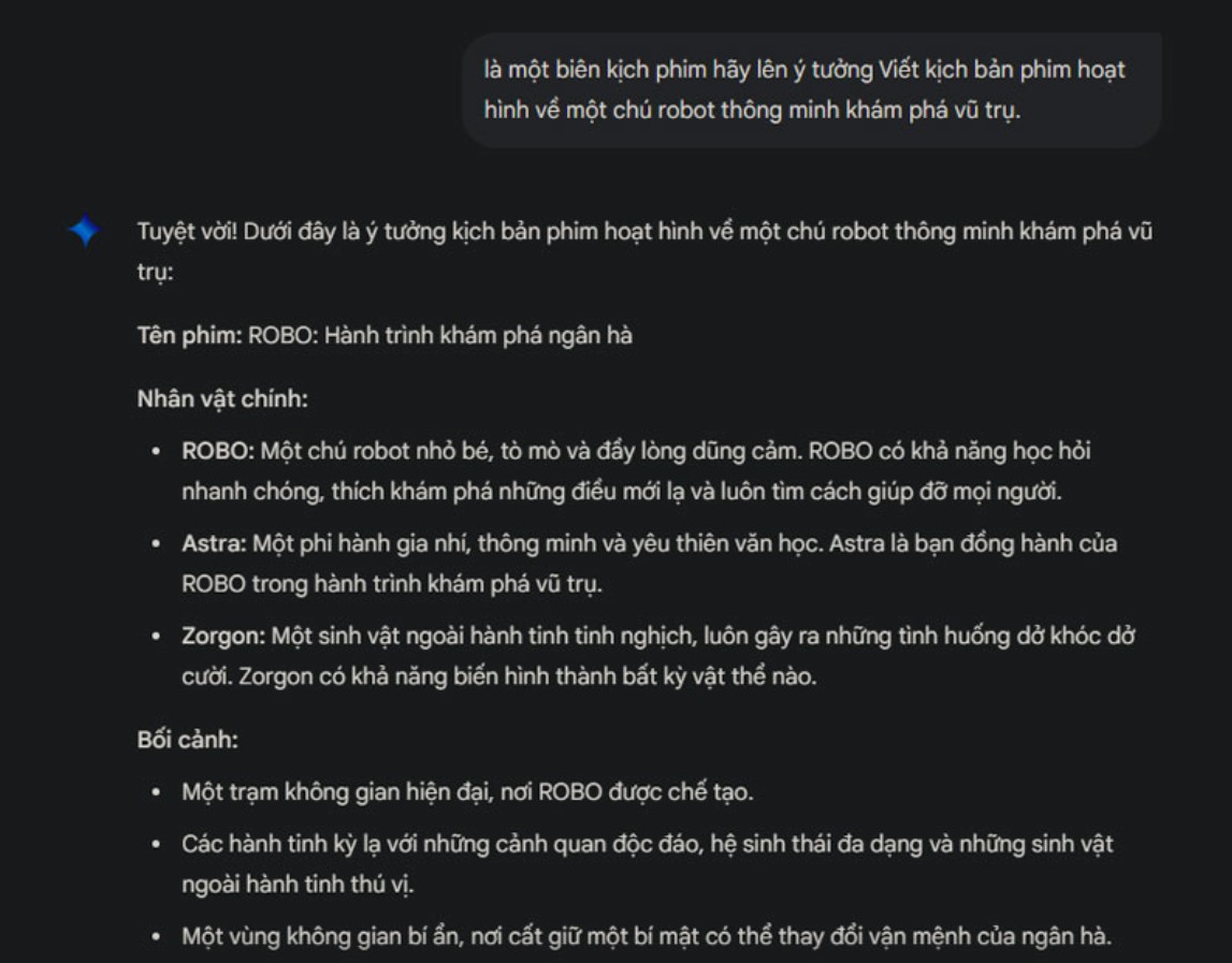 You just need to state your initial idea. For example: "Write a short script for an animated film about an intelligent robot exploring space." The AI will immediately suggest a story structure including a beginning, a climax, and an ending. The AI can also write dialogue, describe scenes, and suggest appropriate plot developments.
