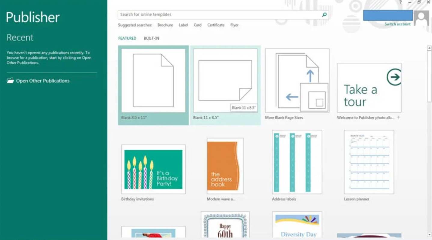 By the time Office 2013 was released, Publisher had added PDF export capabilities and the ability to share via OneDrive. However, as collaborative work platforms emerged, Publisher's limitations became apparent. Despite its cloud storage capabilities, it remained a standalone application on the computer, lacking direct integration with other applications in the Microsoft 365 ecosystem.
