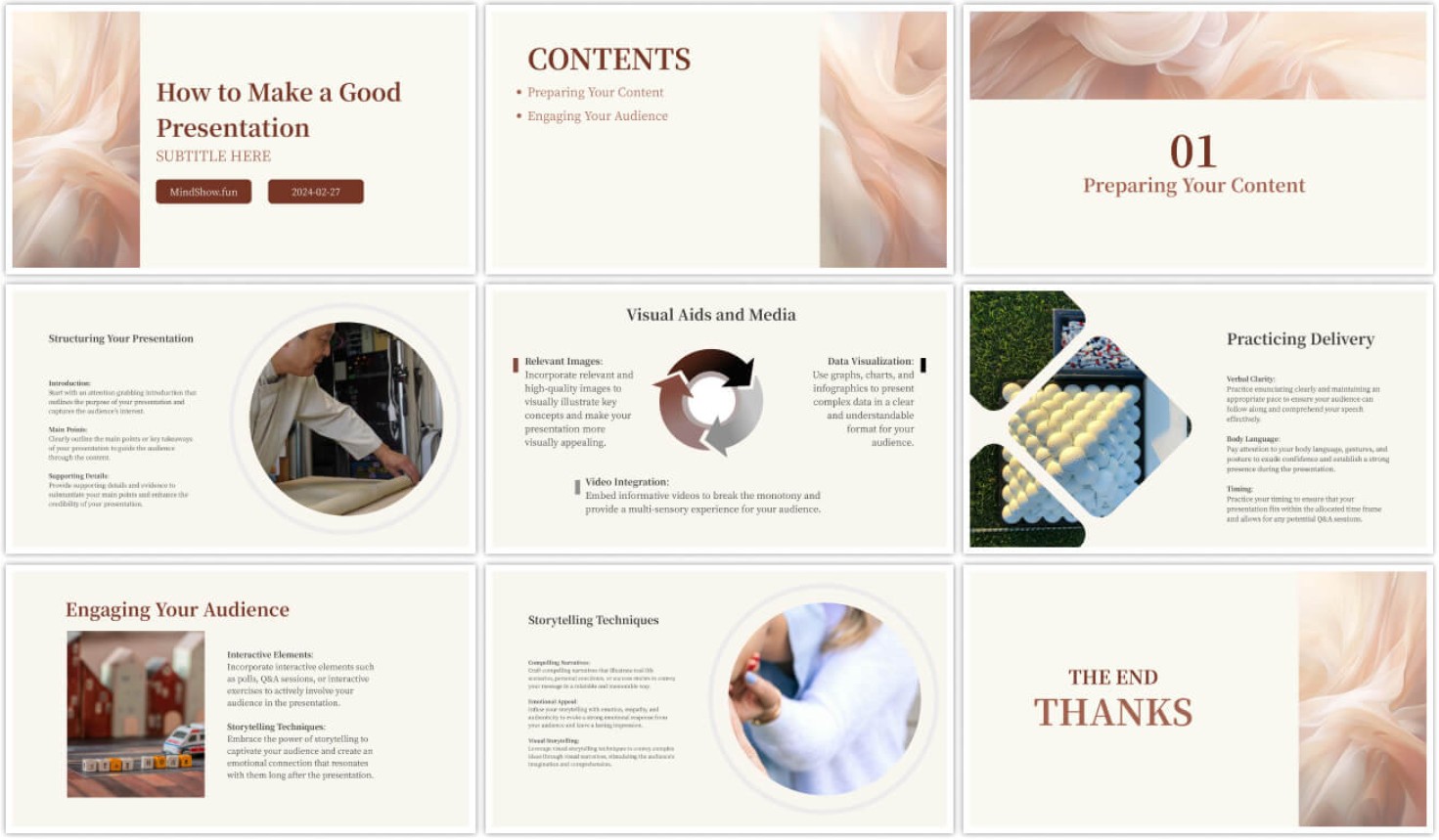 Mindshows don't just create slides; they create a captivating visual experience. Every piece of content you input is analyzed by AI to determine the emotion and message, then selects appropriate animation effects and illustrative characters.
