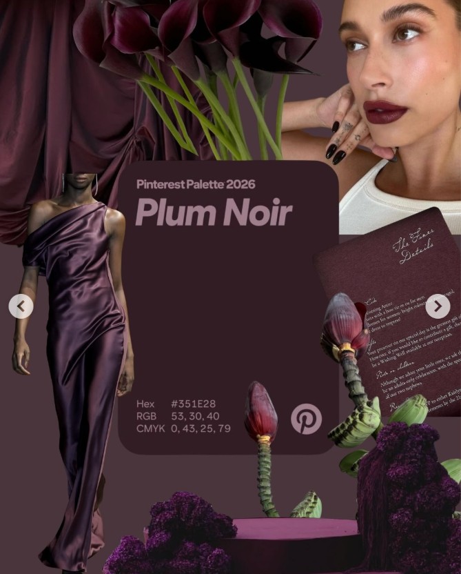 Plum Noir is a deep purple mixed with burgundy and velvety brown, evoking a sense of power, mystery, and inner strength. It's a color of emotional depth, complexity, and personalities that refuse to blend in. Pinterest calls this shade "villain energy": the energy of those who dare to be different, dare to express themselves, and aren't afraid to step outside their comfort zone.
