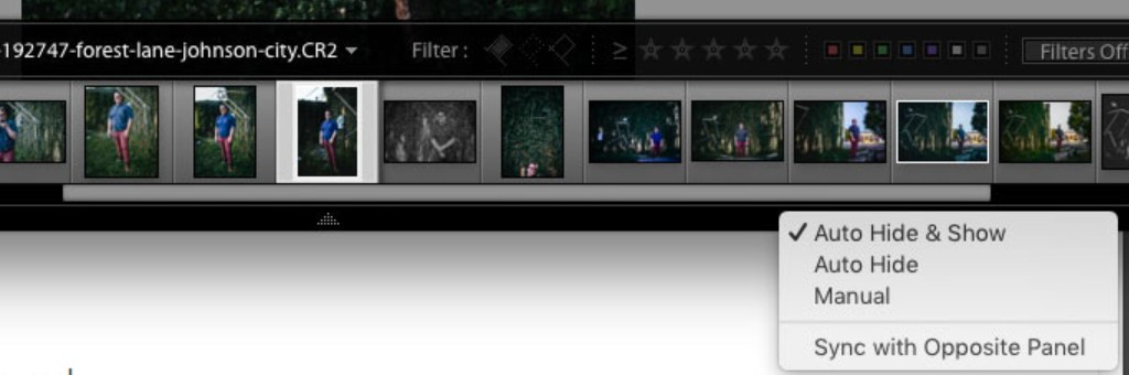 Just right-click on the filmstrip or the left or right panel , then select Auto Hide & Show . When this feature is enabled, panels will automatically hide when you are not using them, only reappear when you hover your mouse over that area. This frees up your screen, helping you focus more on the photo editing process.