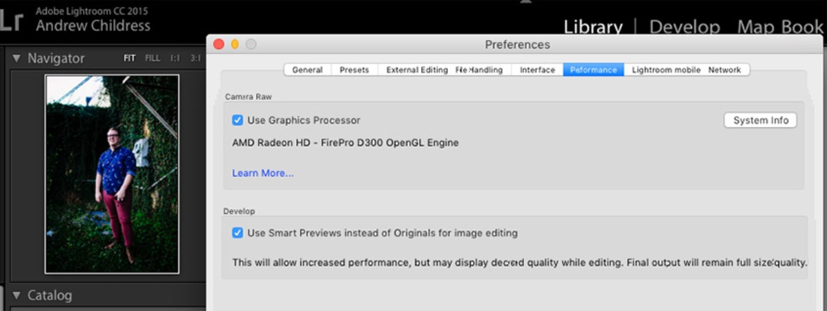 First, go to Preferences > Performance and try disabling the Use Graphics Processor option if you have a computer with an integrated GPU or an older graphics card. Many users have found that disabling this option makes Lightroom run significantly smoother.