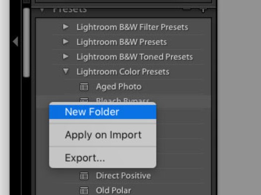 To create a new folder, simply right-click in the Presets panel and select New Folder , then give it a name. Once you have a clear system in place, you’ll find that finding and applying presets becomes much faster. This is also a great way to keep your Lightroom neat and professional, especially if you have a huge preset library.
