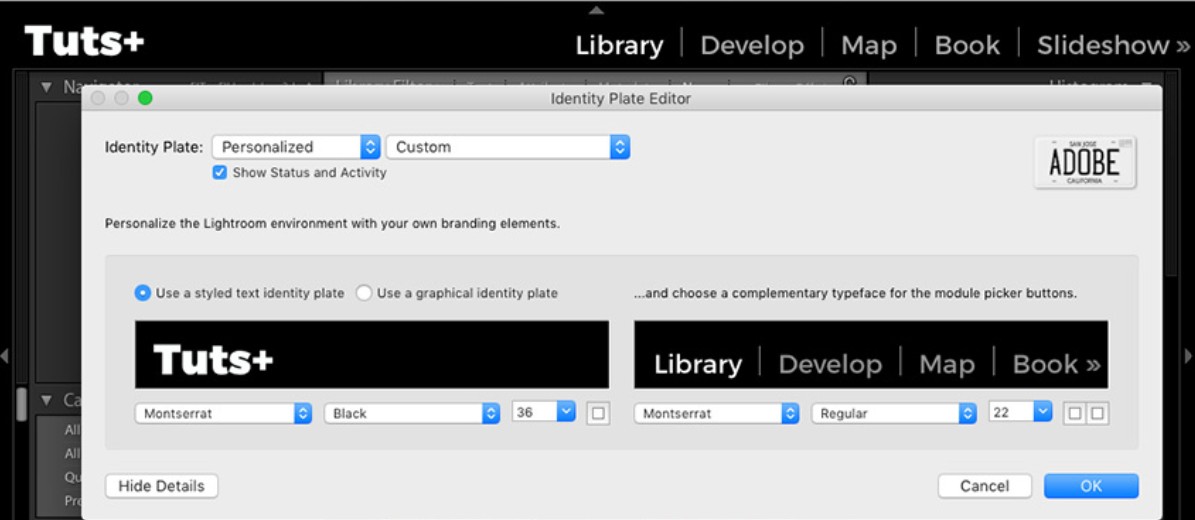 A fun way to personalize Lightroom is to add your logo or personal branding to the software interface. Lightroom allows you to do this through the Identity Plate feature .