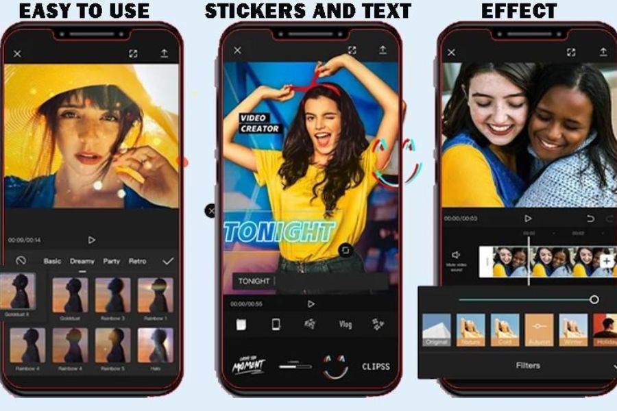 Full tools for cutting, merging, inserting images, stickers, and effects