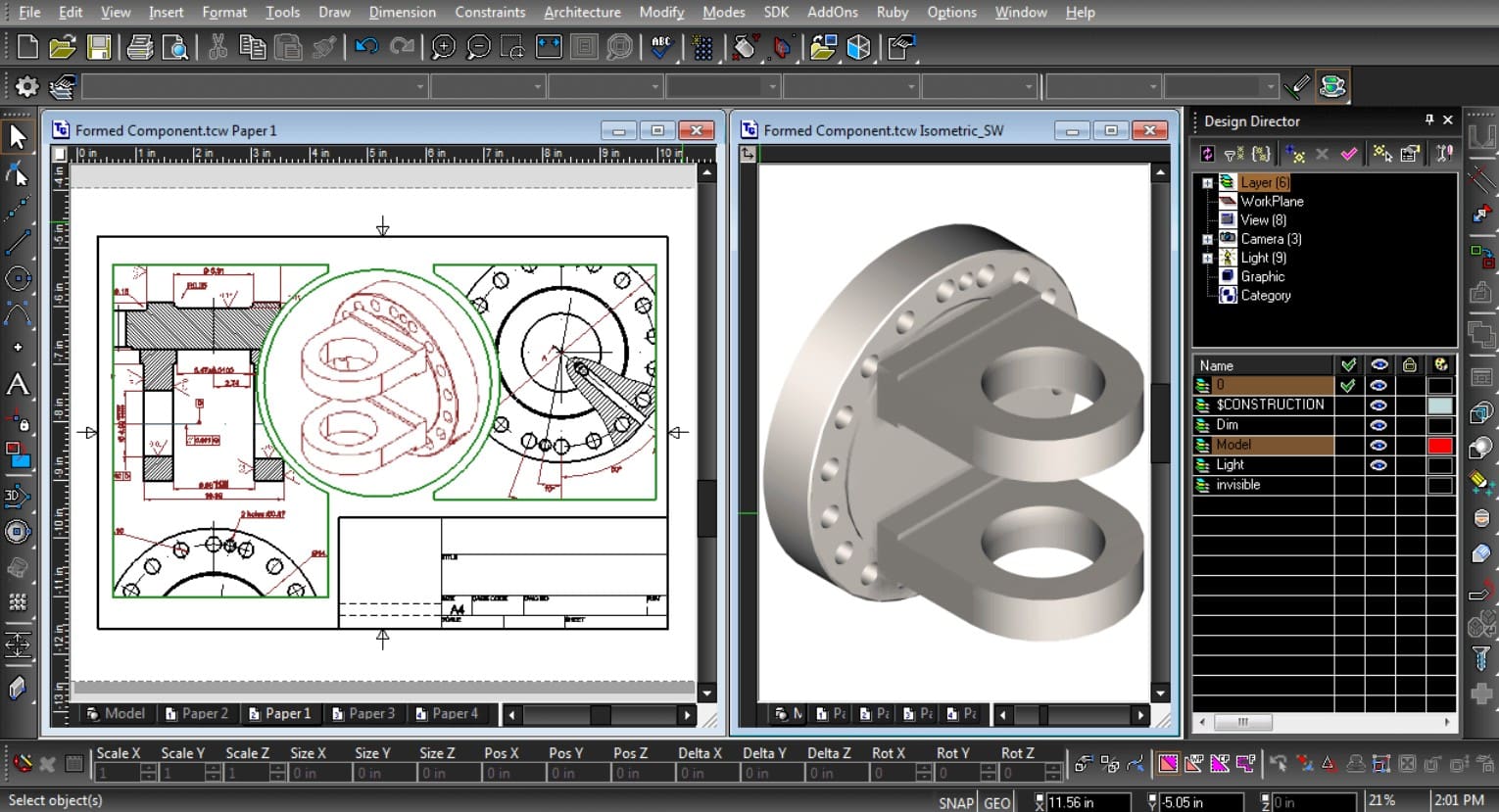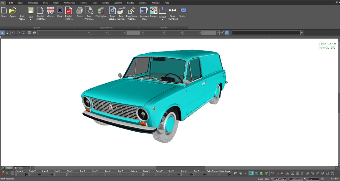 The outstanding advantage of TurboCAD Deluxe lies in its ability to support learners in 3D design with a focus on technical aspects, emphasizing accuracy and parameters. The software's interface has a traditional CAD style, suitable for those already familiar with AutoCAD or similar software.