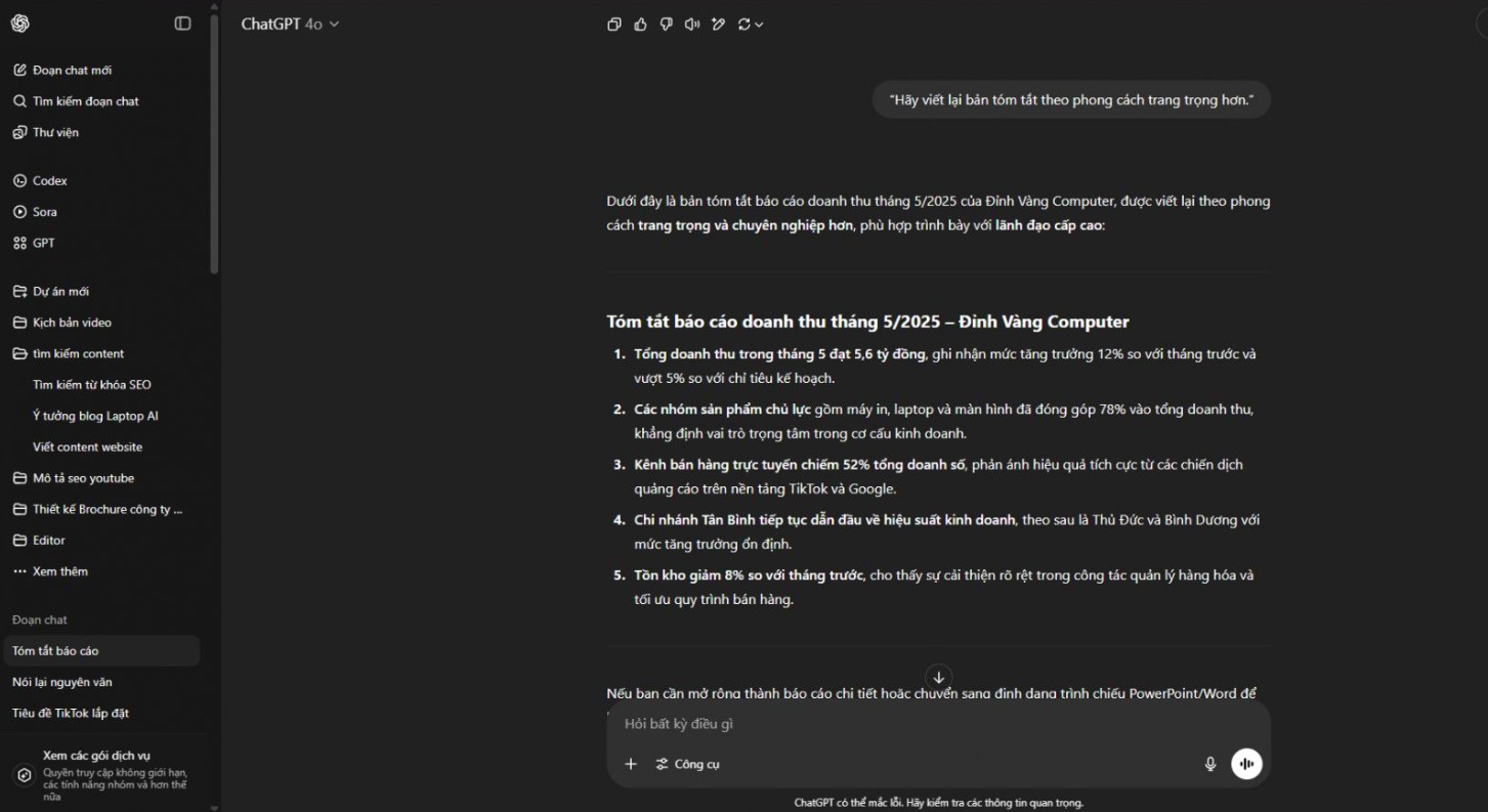 Furthermore, ChatGPT can perform more in-depth requests such as analyzing trends in reports, identifying core issues, or suggesting solutions for summarized content. This allows users to not only save time but also improve their ability to make quick and accurate decisions.