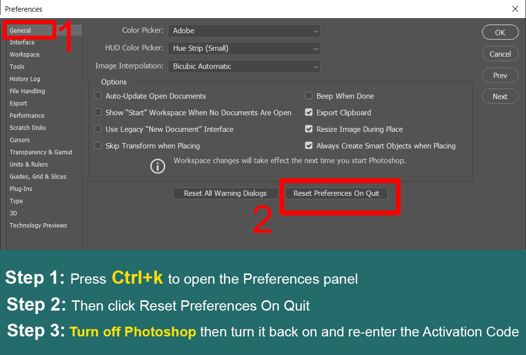 Step 3: Turn off Photoshop then turn it back on and re-enter the Activation Code