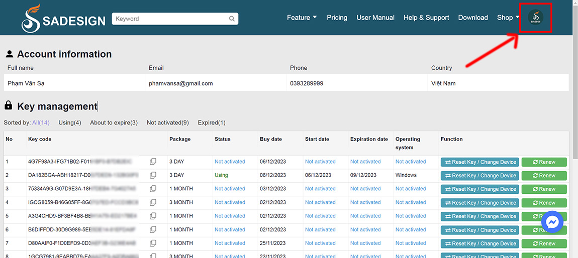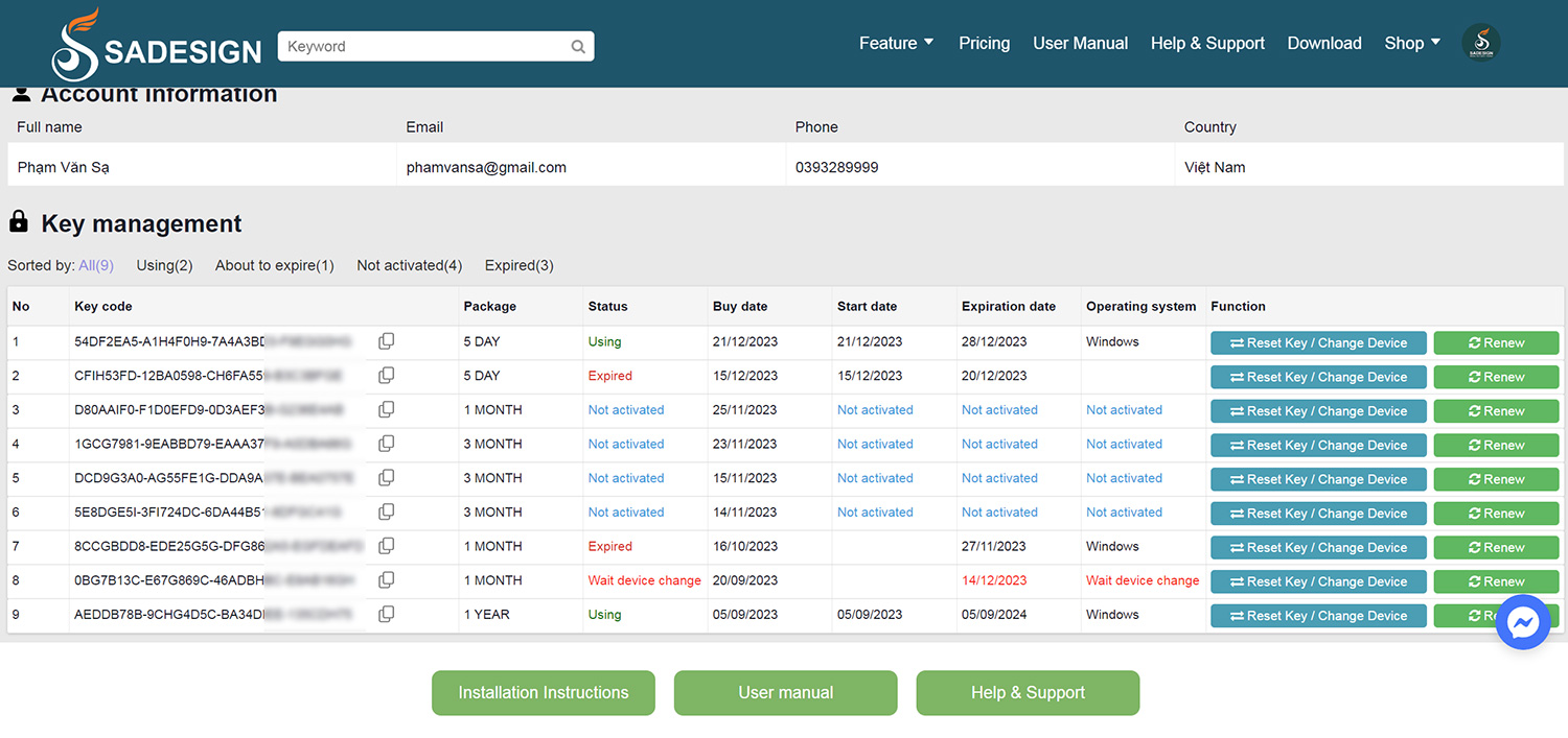 When payment is successful, you will immediately receive an activation code on the website, you can monitor and manage the Key yourself such as Renewal, Reset Key to change the device.